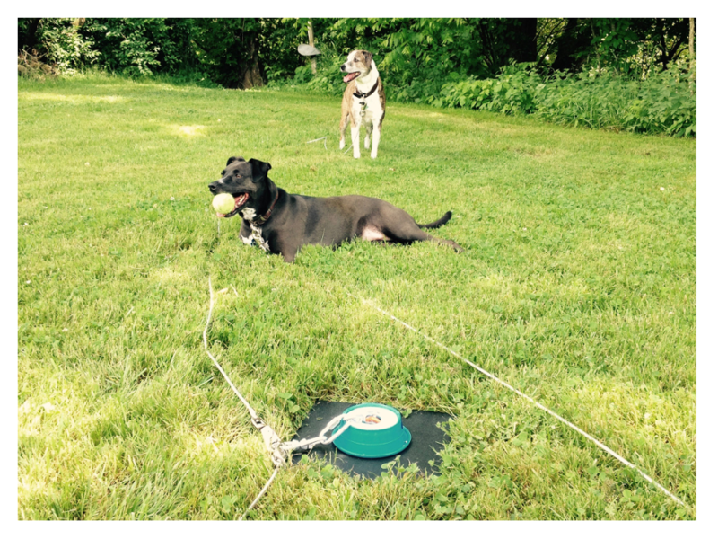In addition to the swivels on the tie out stake and on the tie out cables, we added a tangle-free topper. It basically looks like an upside down bowl.